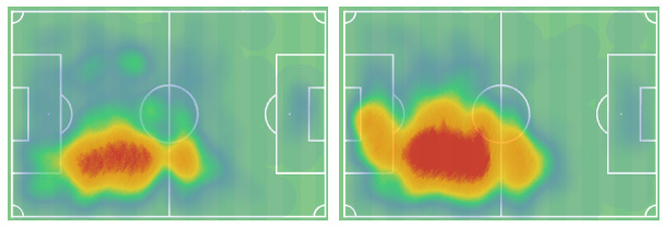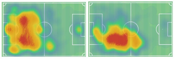 Cameron, like Aasgaard and to a lesser extent Rothewel, has played across the midfield and at times either in the front line or behind the striker. Below we have his heatmap from 24/25 (left) and 23/24 (right). What was the catalyst for such a change? The departure of Luke McCowan.