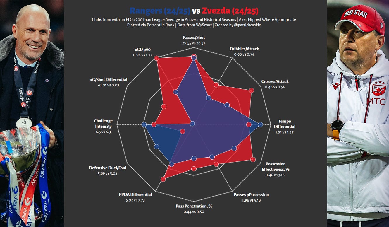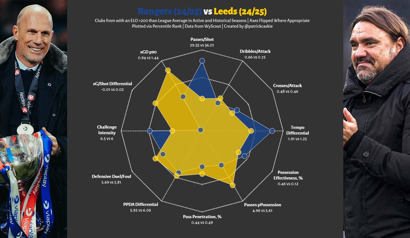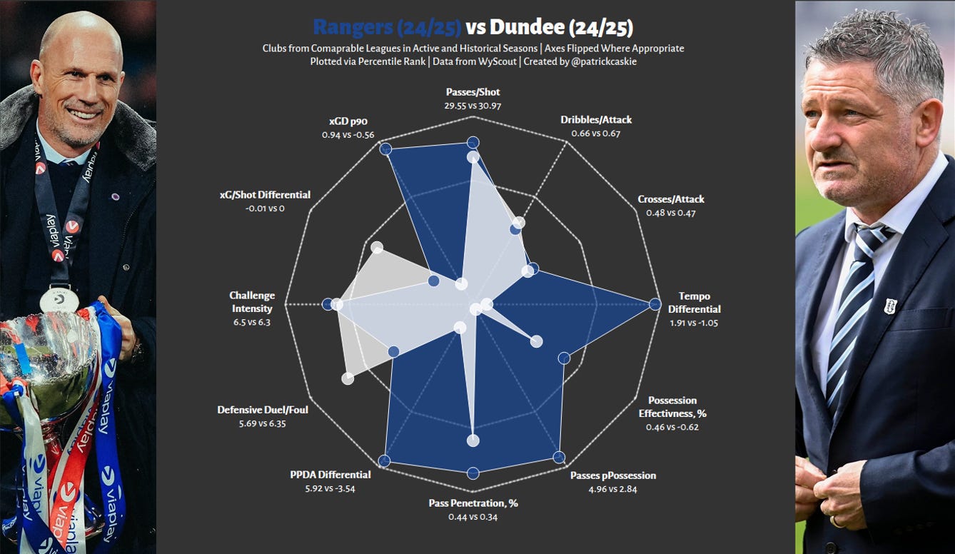 There’s a nearly 350 difference between Dundee and Rangers’ ELO scores, a similar deficit to that between Bayern Munich and St Pauli, and that translates as you would expect to the radar below.