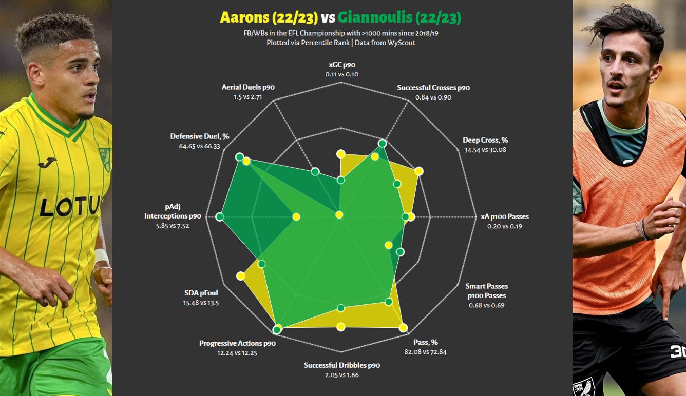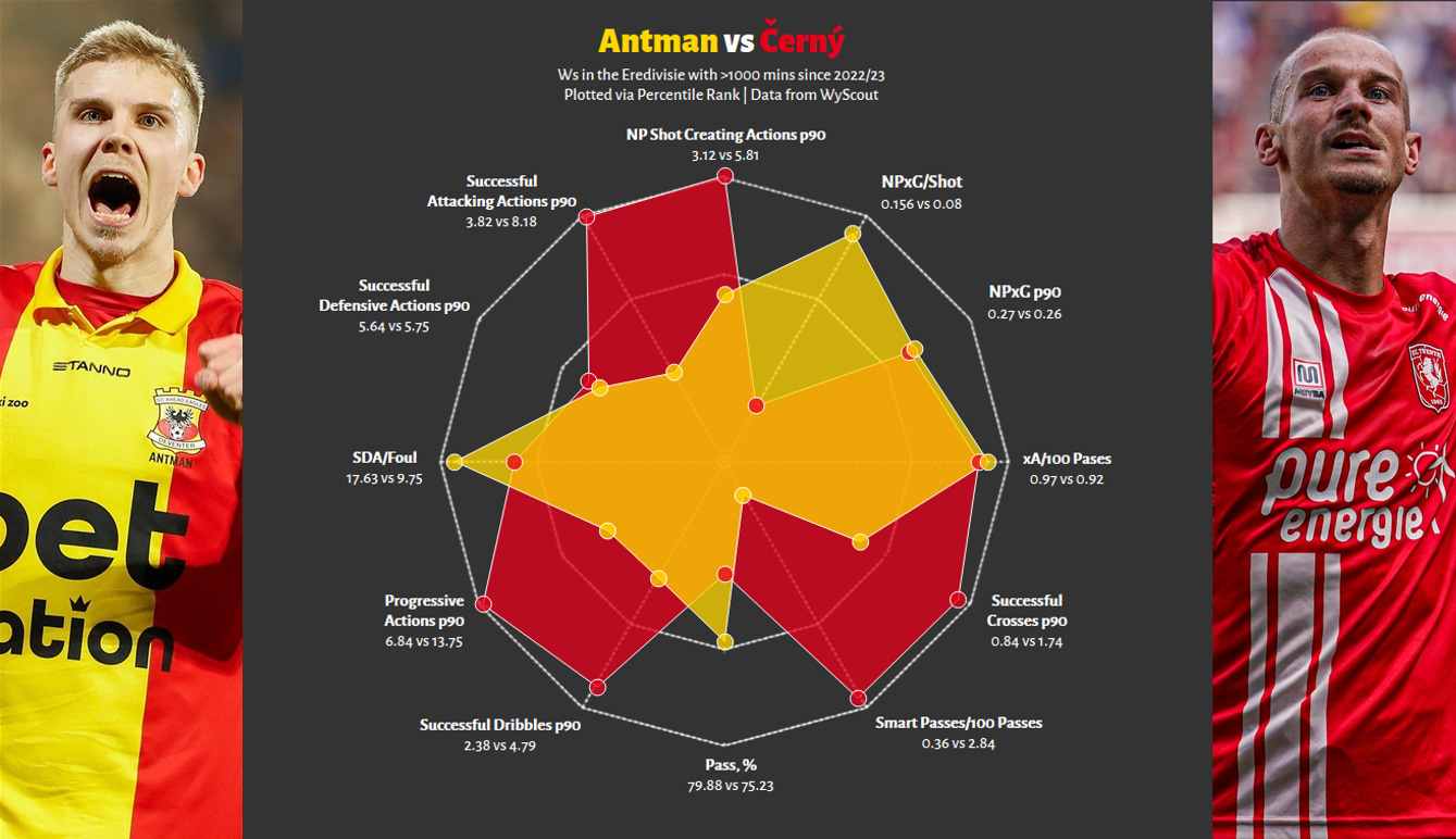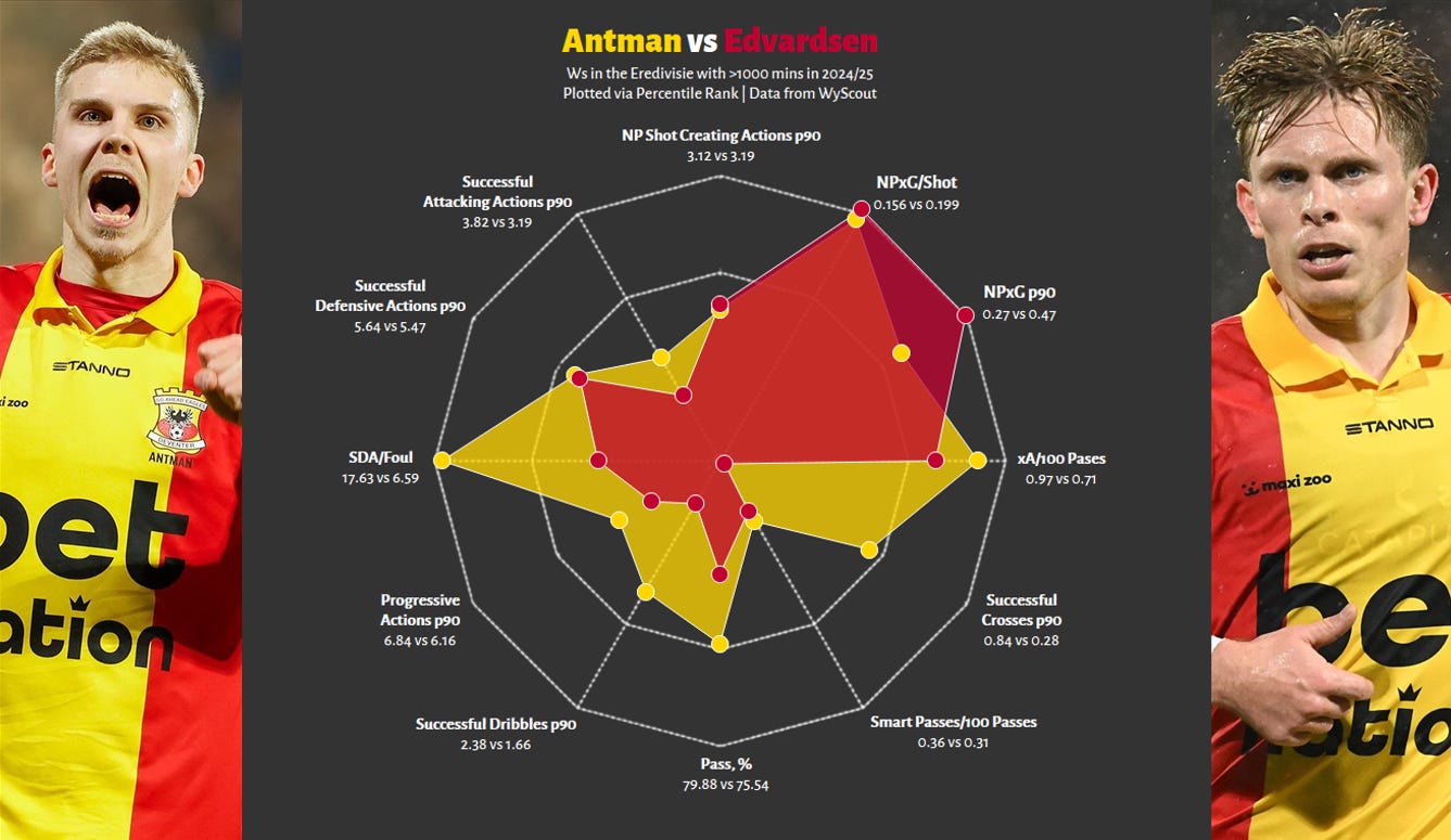 The most productive comparison possible is with the man who owned Go Ahead’s other wing, Oliver Edvardsen, who managed to snag a move to Ajax in January off the back of a fantastic first half of the season. The radar below allows us to do two things: first and most, see how Antman compared against his direct counterpart, and second, help him understand if there were certain things either winger did to compensate for each other; ie, did X dribble more than usual to balance Y’s inability to do so, etc.