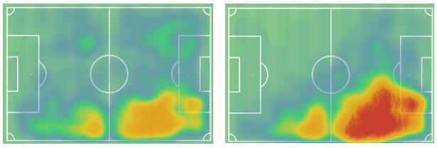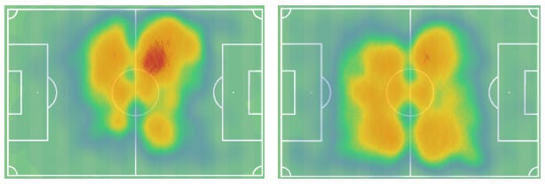 Antman has been signed to play as chalk on the boots RW, which should provide width for his deeper teammates - Inverted RB or right no.8. This is best visualised below. His heatmap from the 24/25 season at Go Ahead Eagles is on the left, and Václav Černý’s is on the right at Rangers. The key difference between the two, and more generally between left and right-footers, is the density of touch within the right half-space, which quickly became the Czechs’ home at Ibrox. Antman is active there, sure, but he’s more likely to be found right of the penalty box, as you would expect given accessible angles. I almost always prefer a left-footer on the right.