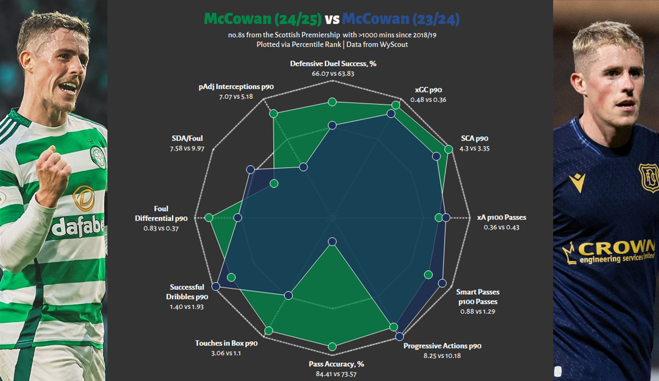 With our focus on McCowan, many will ask, was he able to continue this form at Celtic? Yes and no. From a point of view only concerned with raw output, then yes, as expected, joining the best team in the country proved to be anabolic for him, yet in relative terms, he was no longer amongst the best midfielders in the league, more so a handy backup. I think it’s fair to expect Cameron to experience a similar sort of inflationary pressure, albeit slightly less, as he is not as good and is joining a weaker side.