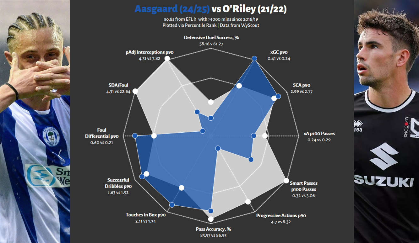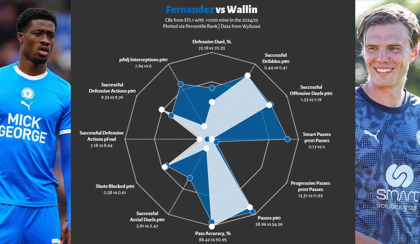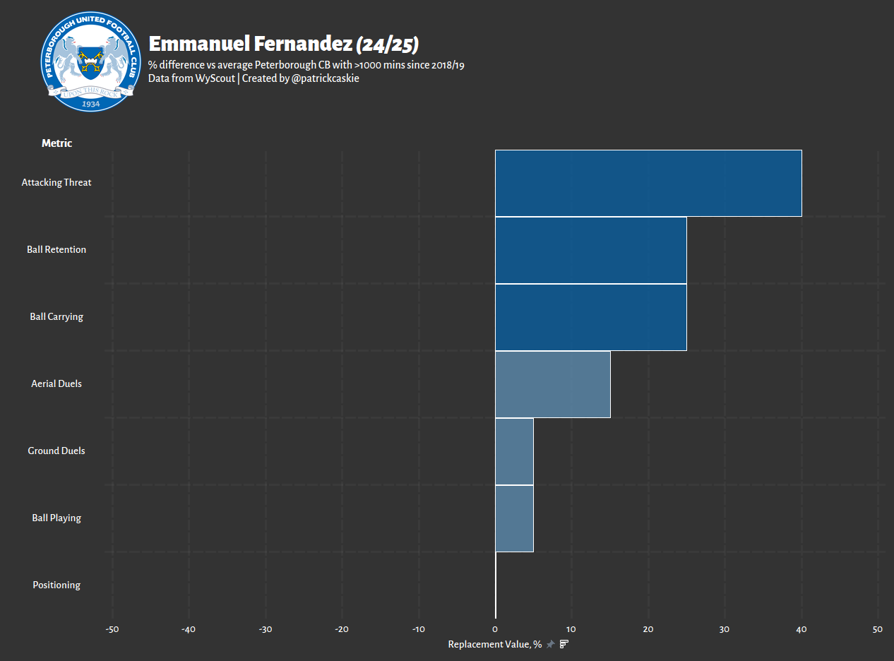 So what does Fernandez’s partner look like? For the vast majority of the season, he played alongside summer arrival, Oscar Wallin. The Swede is also right-footed, hence why Fernandez was forced to play on his “weaker side” from time to time. What we can extract from the graphic below is that all Peterborough CBs will score well in build-up related output, somewhat muting the impressiveness of Fernandez’s production and that he was the more aggressive dueler of the pair. Neither were massively aggressive, but Fernandez was certainly more front-footed.