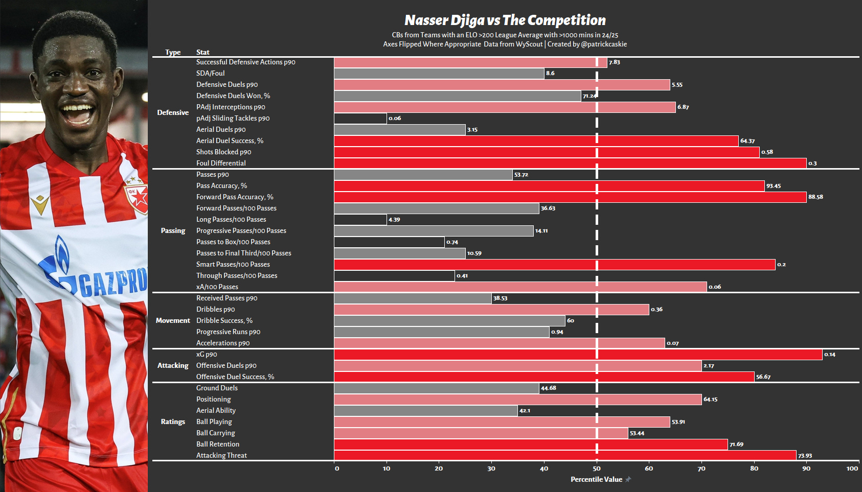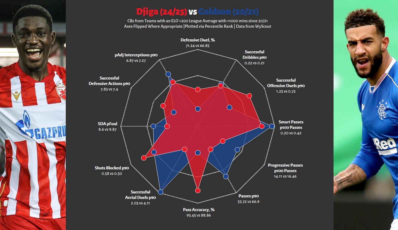 Most impressive: defensive ability, aerial ability and ball carrying, all of which he is a somewhat outlier relative to his teammates. He’s not necessarily a high-output dribbler like Fashion Sakala or Ryan Kent, but is successful when he does so and carries a progressive quality, consistently driving forward with the ball for >5m. He’s less of the small space and stylish sort and more so the long-stride space invader; this is not ideally what you want at Rangers, given the dearth of large spaces in domestic play. Both his defensive ability and ball-carrying success are primarily a result of his ability to hit high speeds and to maintain this repeat intensity across the 90. A high SDA/Foul ratio is always a good thing; limiting fouls when still actually defending is a good proxy for positive decision-making. His height makes him a factor in aerial battles and bleeds over into other aspects of his play.