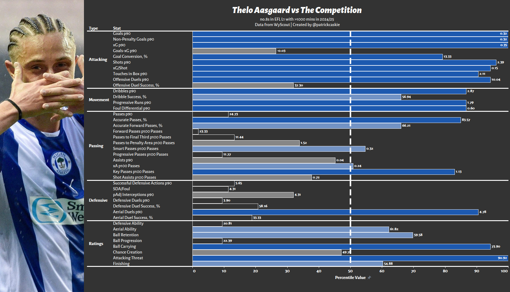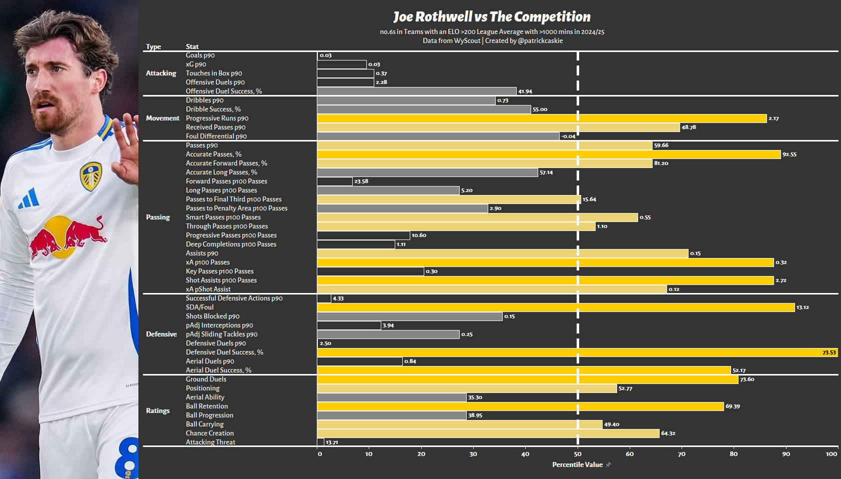 If we head first to the bottom of the graphic, where the ratings are housed, which attempts to provide more approachable insight than all the loose metrics themselves, and Antman is above the 50th percentile for all KPIs besides “ball retention”, which, to be frank, we don’t care about in this context.