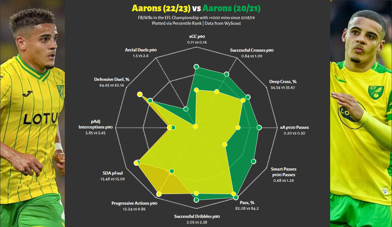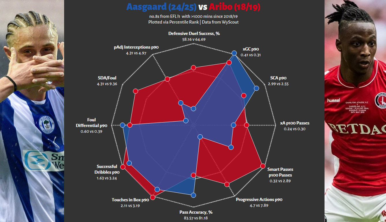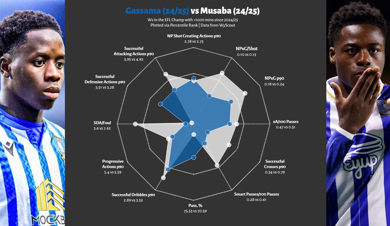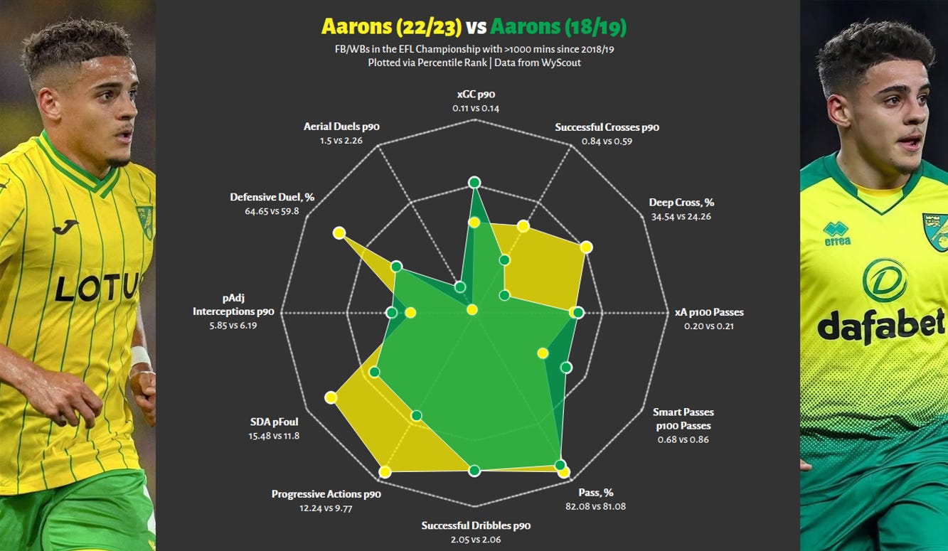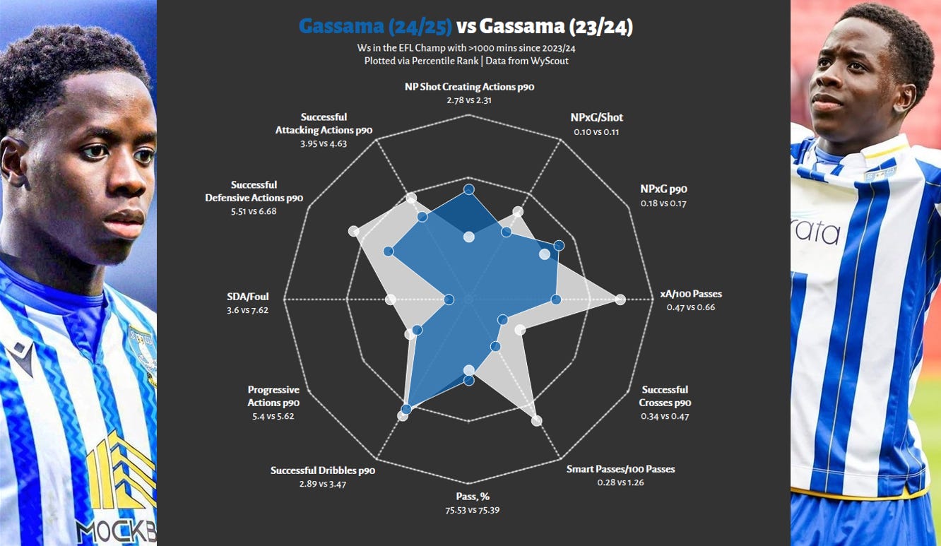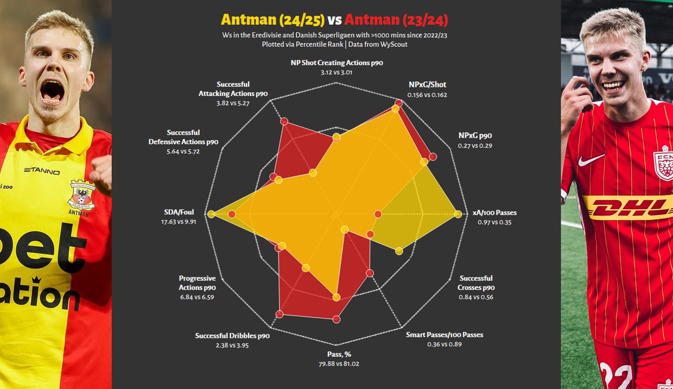 Yes, even if the red radar is slightly larger. At FCN, Antman was more of an inside forward - more dribbles, more goals, less creation. In contrast, in 24/25, this output did not fall off a cliff, whilst he significantly improved his chance creation, adding another string to his bow. Importantly, this is not a zero-sum game; these are not two competing players, but the same man, who impressed in two different contexts, and has shown the ability to play as more of a goalscoring dribbler as well as an all-rounder.