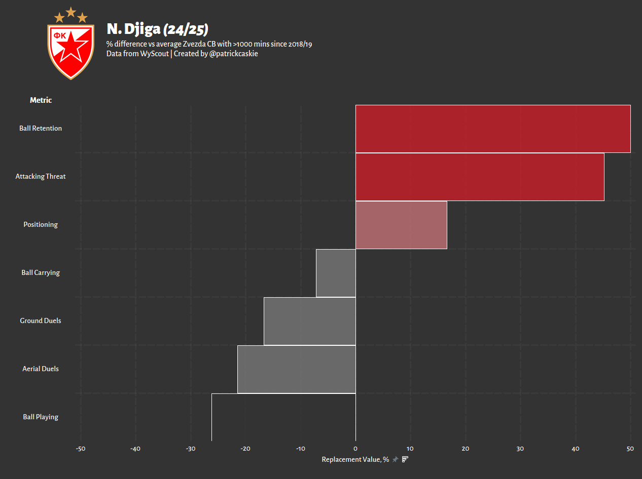 Fernandez was a relatively low quantity dueler, both on the ground and in the air, but managed average to above average success and enjoys a slide-tackle in a similar way to Leon Balogun. He’s capable of defending space and man, but fouls far too often. In possession, he is much like Djiga too, not necessarily the most accomplished or penetrative, but used to a high pass count and reliable not to turn over possession. His high smart pass share is encouraging, suggesting that there is something to work with there. But it should be noted that he is again, probably even more so than Djiga, not the type of CB you want to lead build-up; he is more than competent to support, but this is not a pure ball-playing profile.