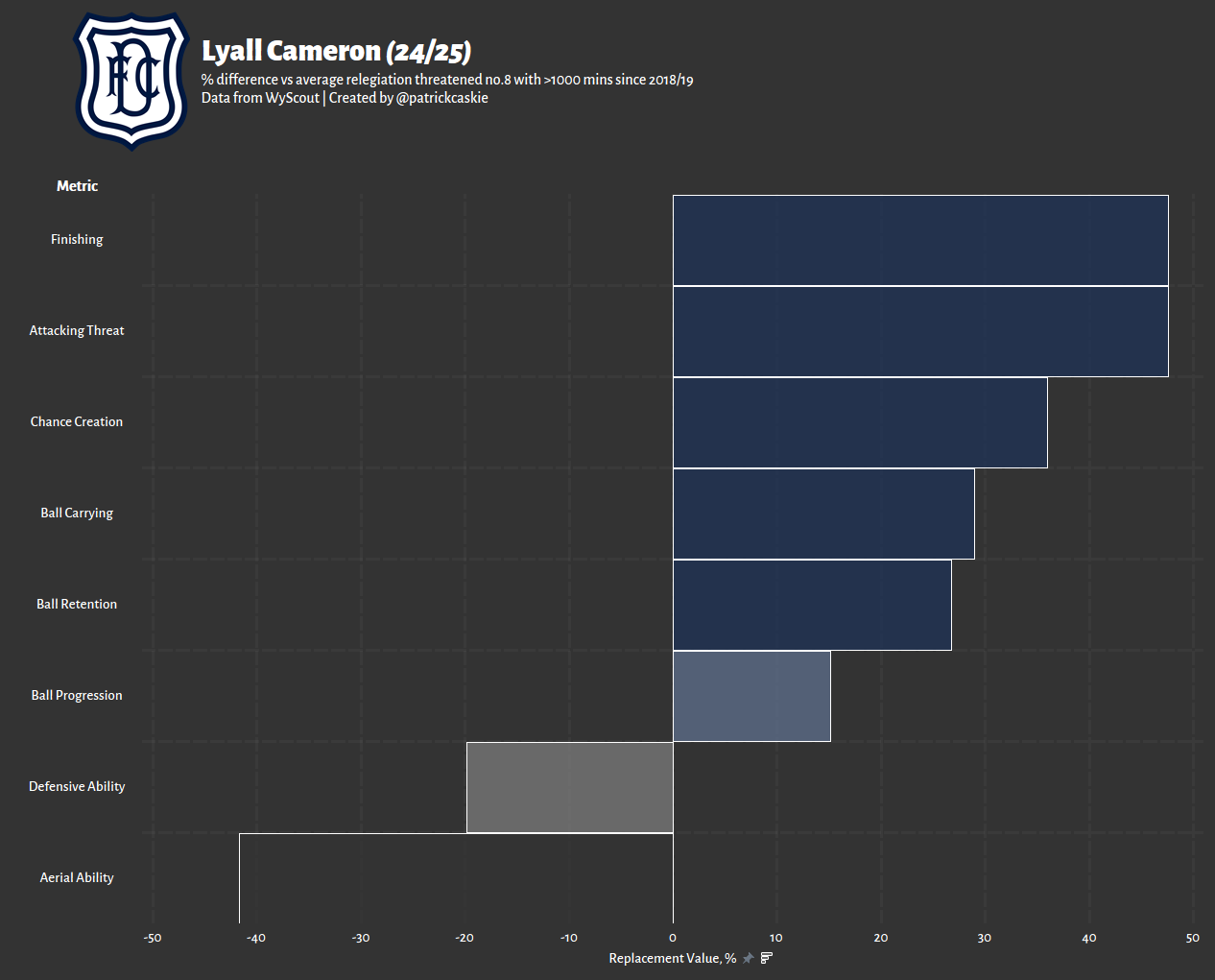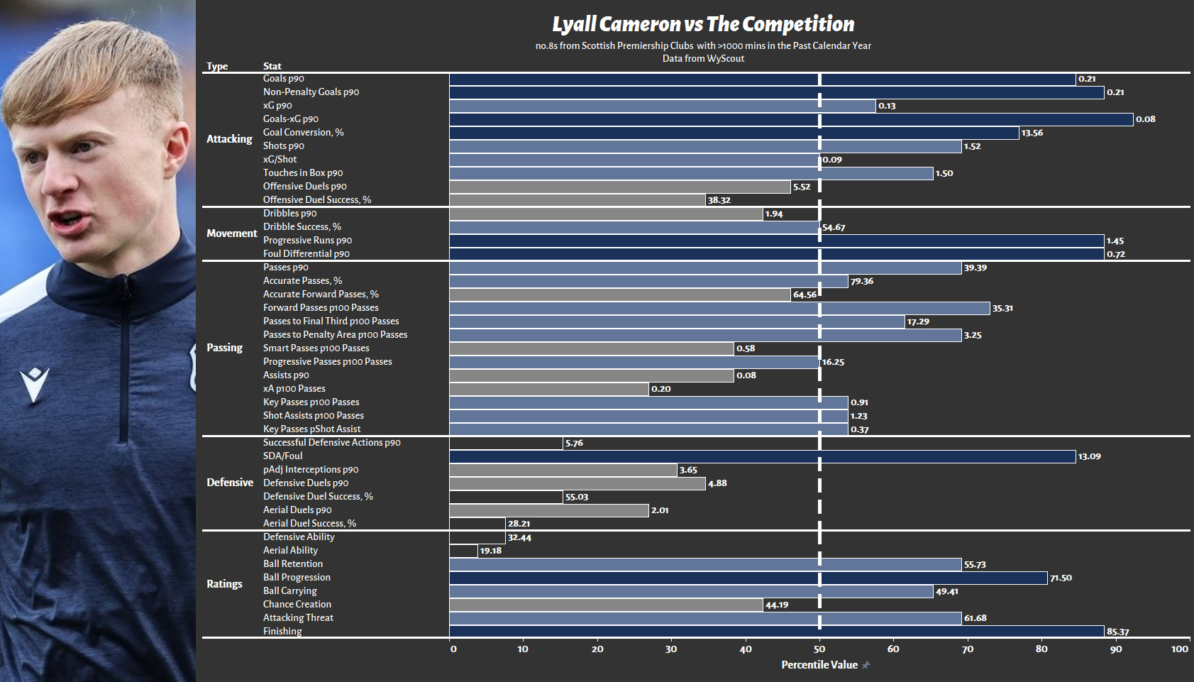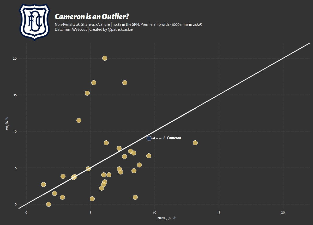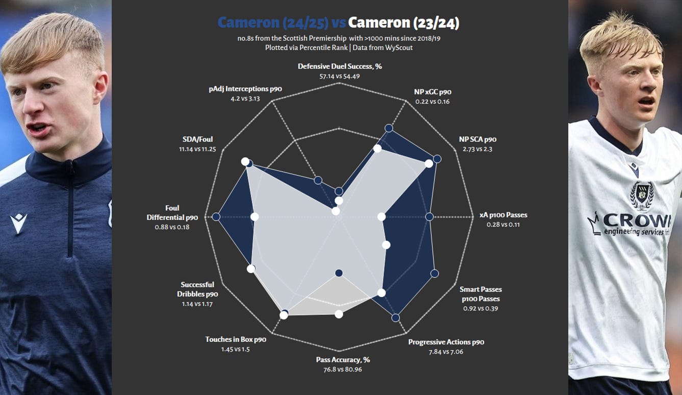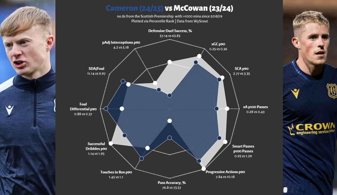 The next question is how he compares to former Dundee star turned Celtic player Luke McCowan. McCowan was more of a conventional midfielder than Cameron, playing slightly deeper and more centrally, as well as taking more set-pieces. Nonetheless, he was also the superior footballer; he provided everything Cameron did but more and with slightly greater defensive output. Cameron is younger and spent his standout year in a worse Dundee FC side; however, the obvious corollary is that it was worse because it missed McCowan.