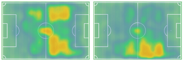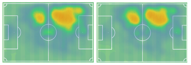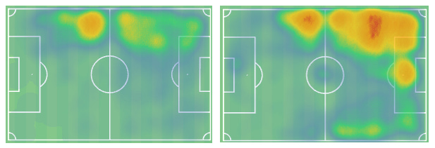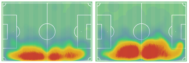 Fernandez has played primarily as a RCB in a back-4 but has also played on the left and occasionally as the central CB in a back-3. When compared to John Souttar (right), we can see that his average action is far deeper, which makes sense given the relative quality of both sides. What this means is that Fernandez may be well equipped to defend high and park himself halfway up the pitch in possession, but may not have much experience doing so.