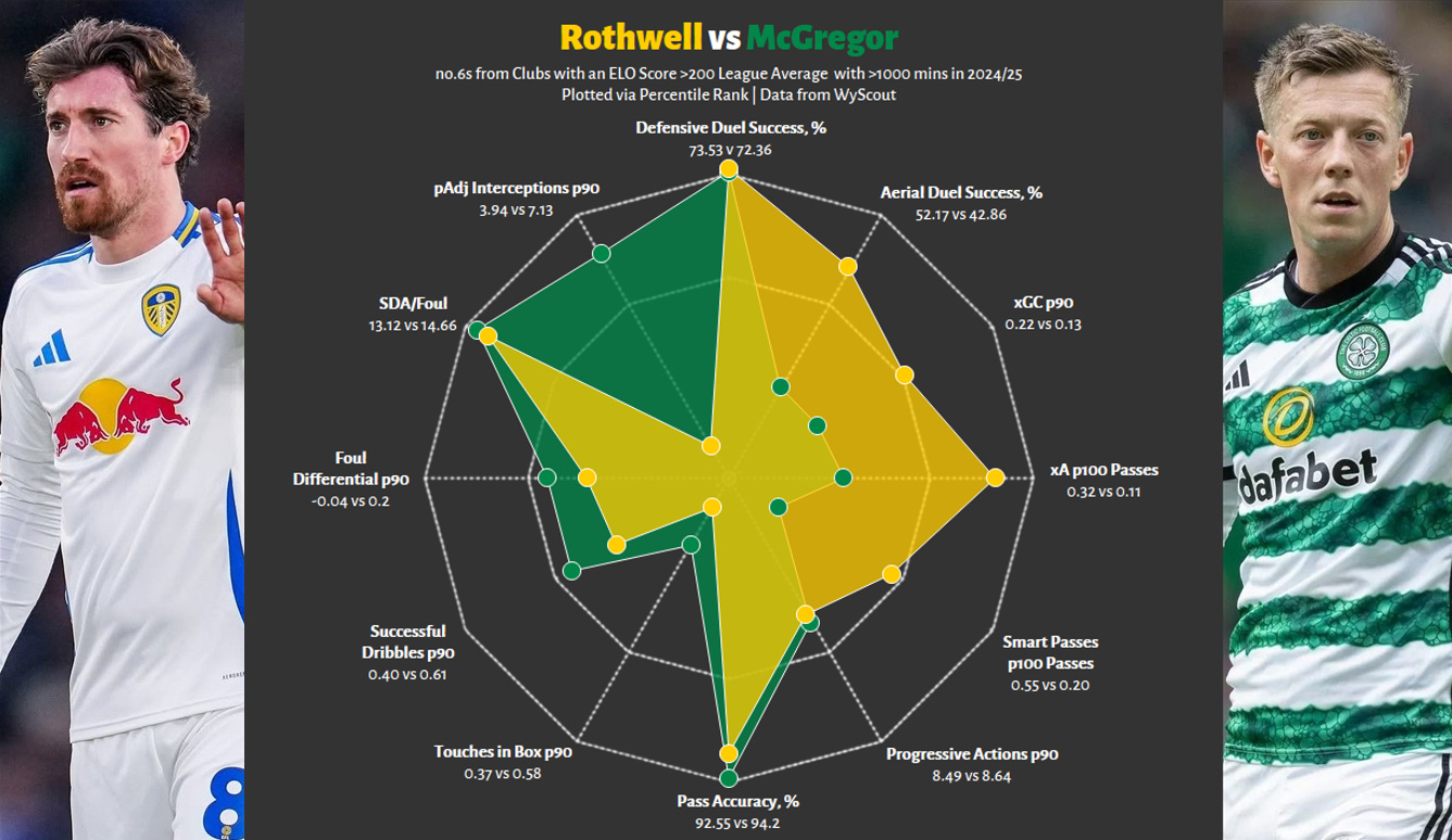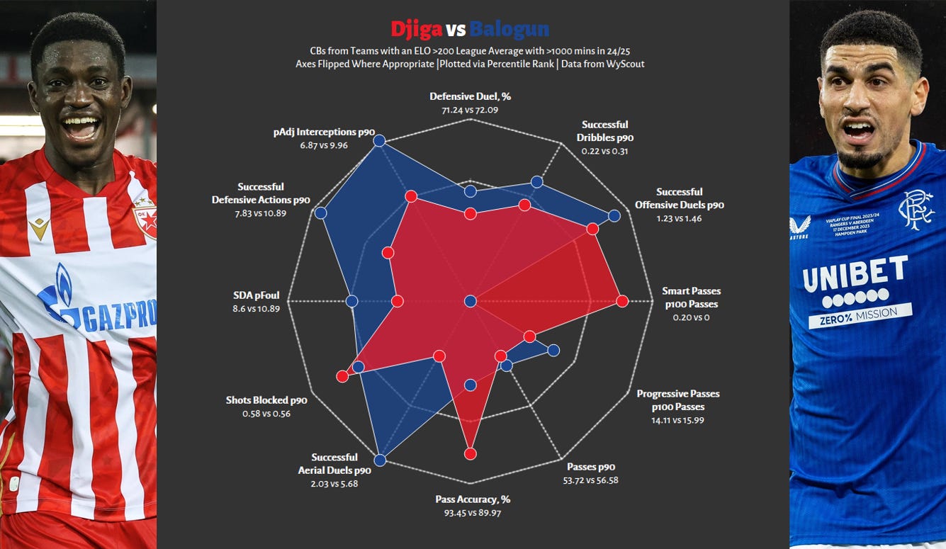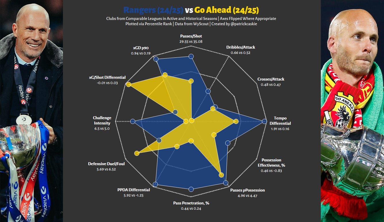 Rangers of 25/26 will hopefully distance themselves from the lingering stench of 24/25; however, given the de facto dynamics of the Scottish Premiership, last season’s metrics are helpful for benchmarking. Rangers and Go Ahead are very distant cousins, maybe just members of the same clan, the throughpoint being a higher possession approach, funnily enough, we were slightly more direct (passes/shots) than Go Ahead, which is hilarious. This will not be a Rabbi Matondo situation where no overlap between previous club and new club exists, but it’s not quite Nasser Djiga, more later.