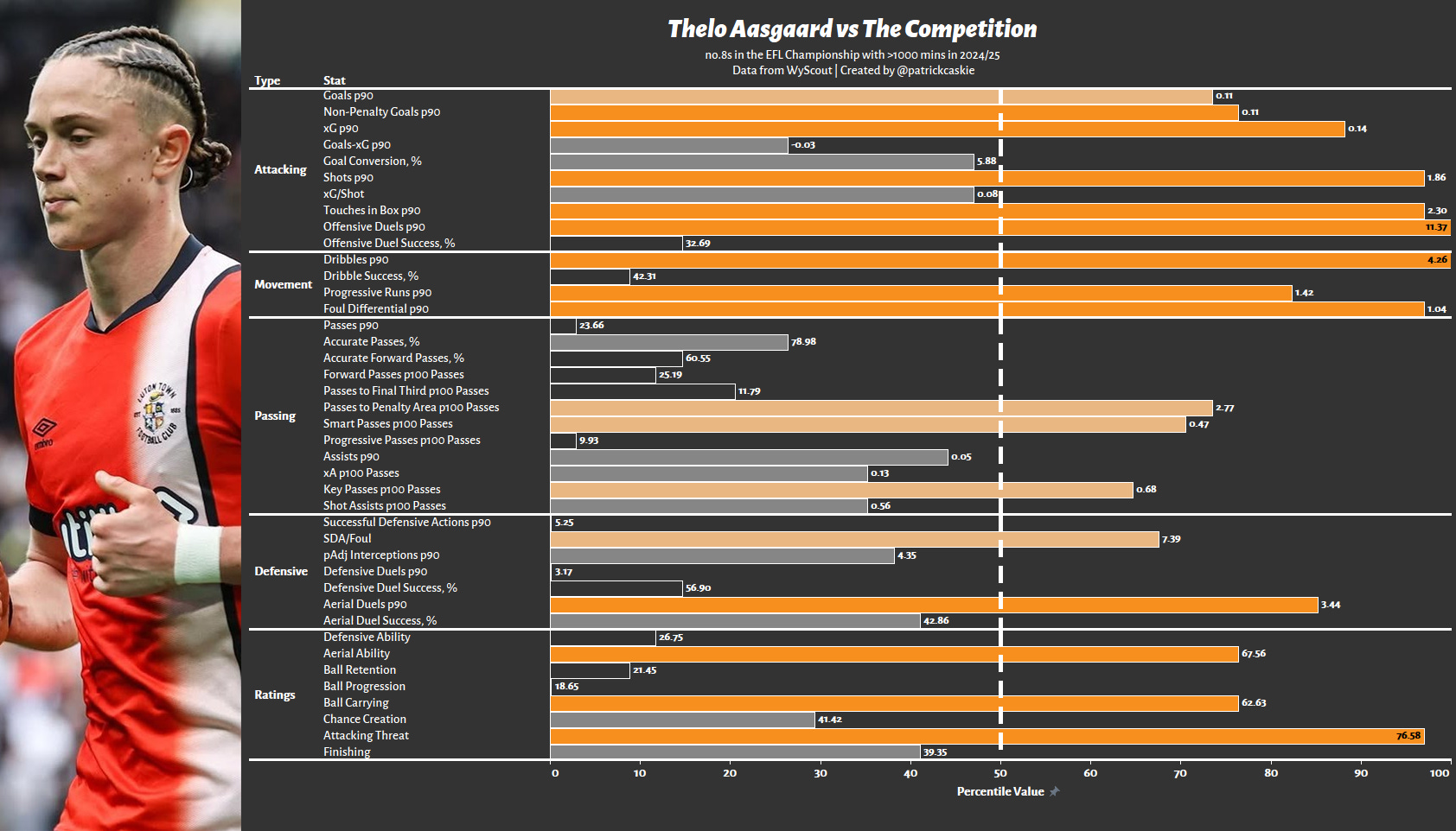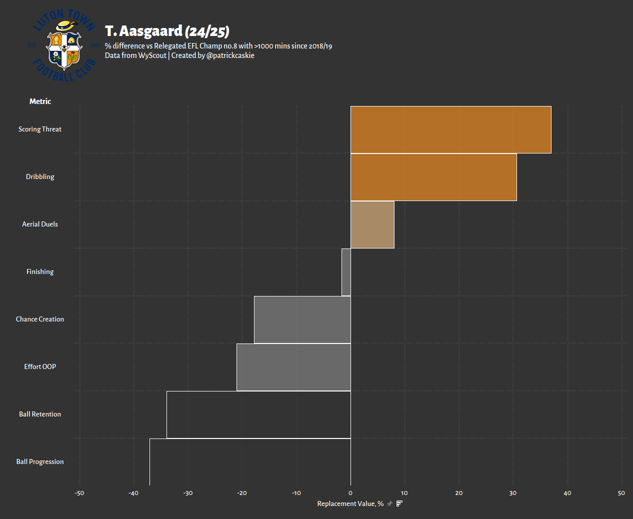 The graphic above, filtered only for no.8s in relegation-threatened Premiership sides, effectively captures the value he provided to Dundee. It reads a lot like what has already been discussed, with the obvious strengths in the final third and deficiencies out of possession. The question is whether he can maintain such output whilst being neither the star nor co-star and in a role more like a valued local hire who has a few speaking lines.