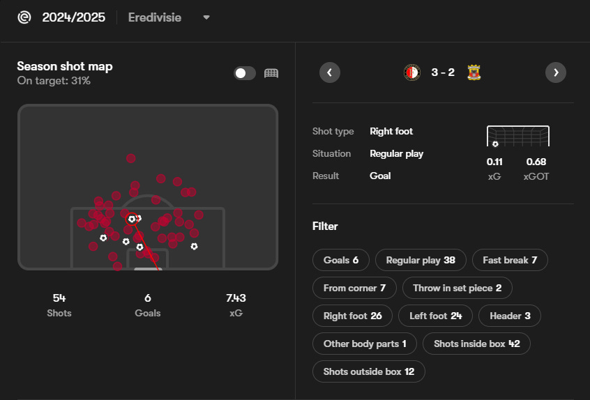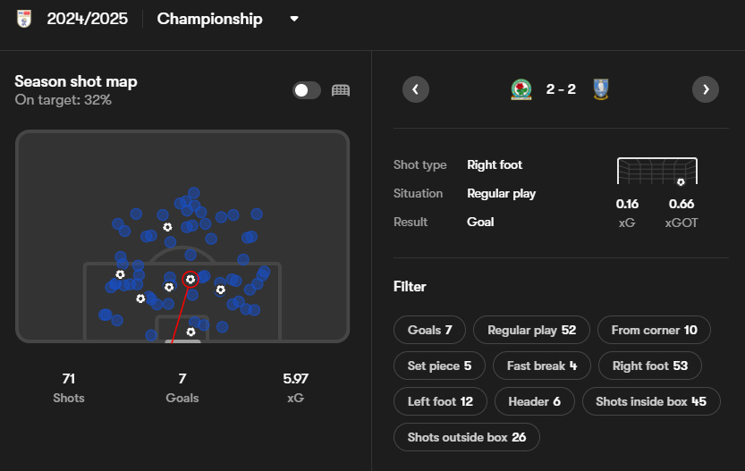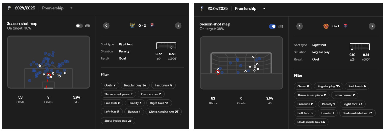 One thing that we must put a lid on before it bubbles over is his goal-scoring. In 24/25, he was amongst the most threatening as evidenced in the shares scatter; however, the actual number of goals he scored can be seen as a slight misnomer. Below and to the left, we can see the shot location map and below to the right, his finishing map.