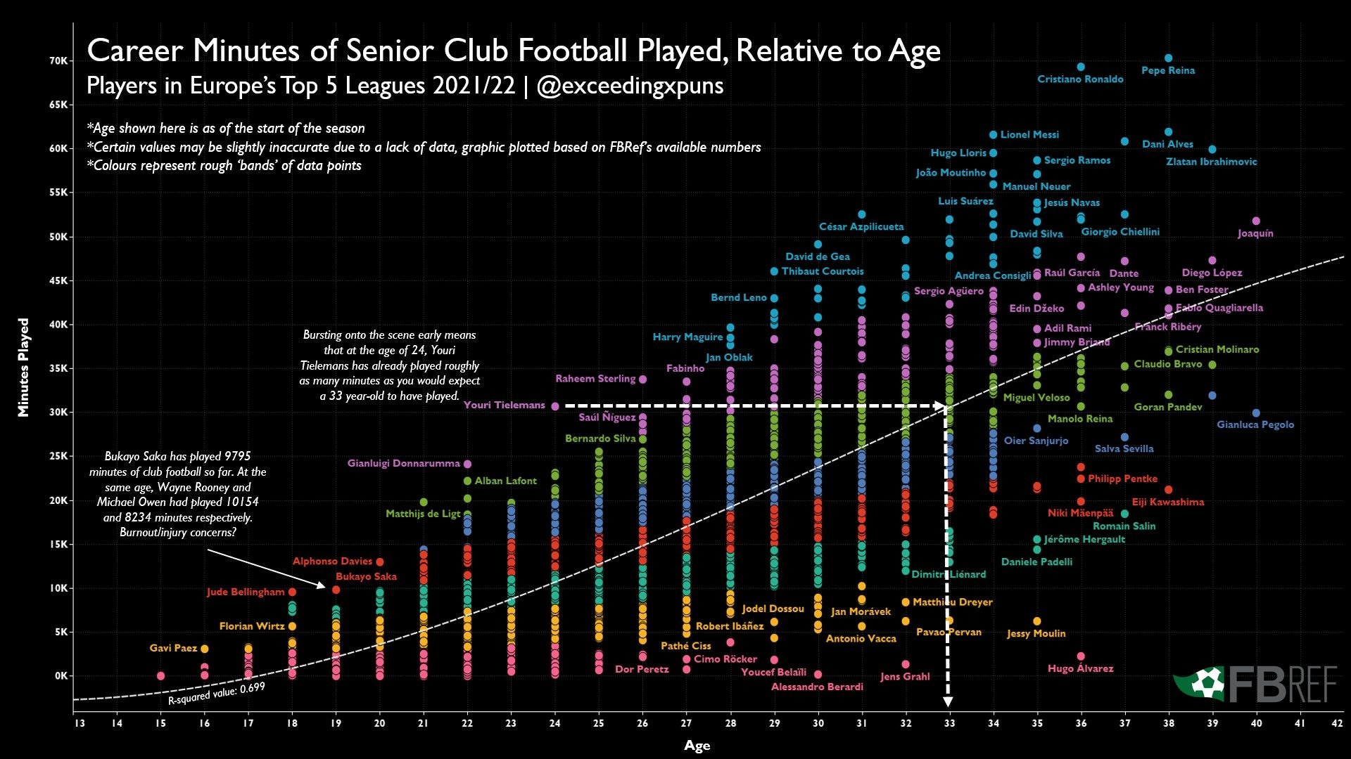 One of the greatest and simplest data viz posted to Twitter was done by @exceedingpuns, who plotted all top-5 league players total career minutes against their age, in an attempt to find a rough guide to how much the average player plays at age x, which you can see below, remember this going forward as I will return to it multiple times.
