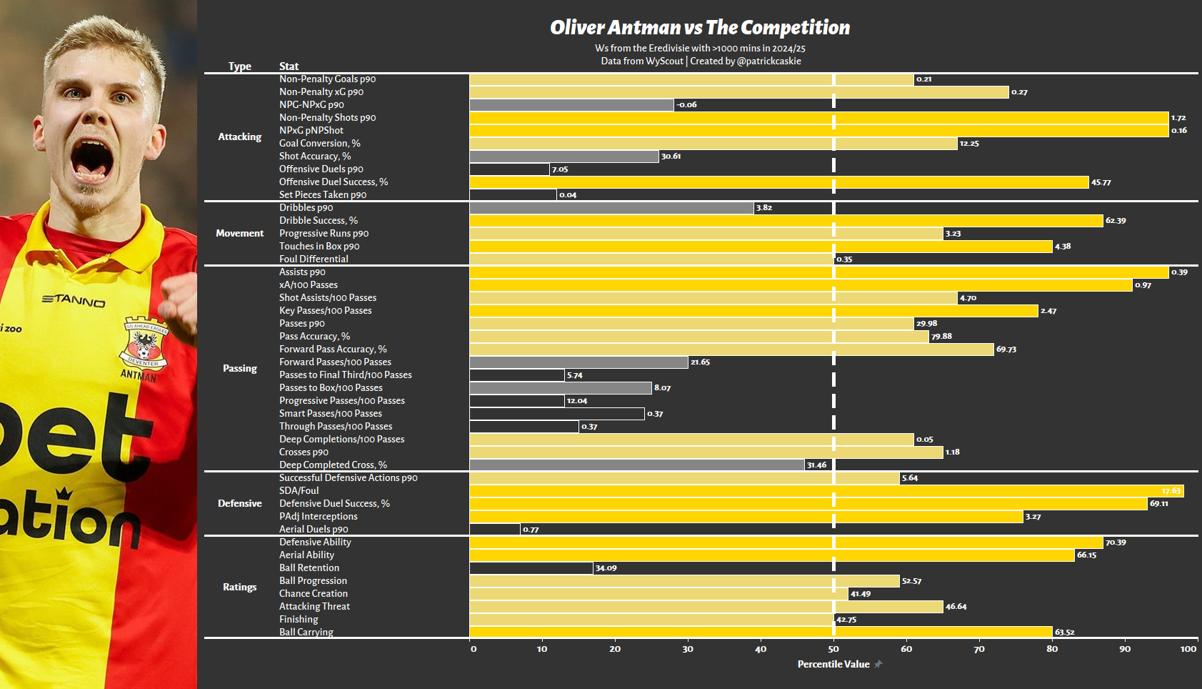 When looking at his assists in 24/25, at the time he struck the ball, 2.27 opposition defenders were ahead of him on average, whereas Rangers wingers faced 4.45. Not a single goal created by a Rangers winger in 24/25 occurred with <2 players ahead of the man playing the pass. One can make the argument that this is partly a skill issue. Antman is more capable of beating his man and hitting the byline, thereby reducing the number of defenders ahead of him. Still, you would be crazy to think he will be able to easily access these scenarios as often at Ibrox as he did in Deventer.