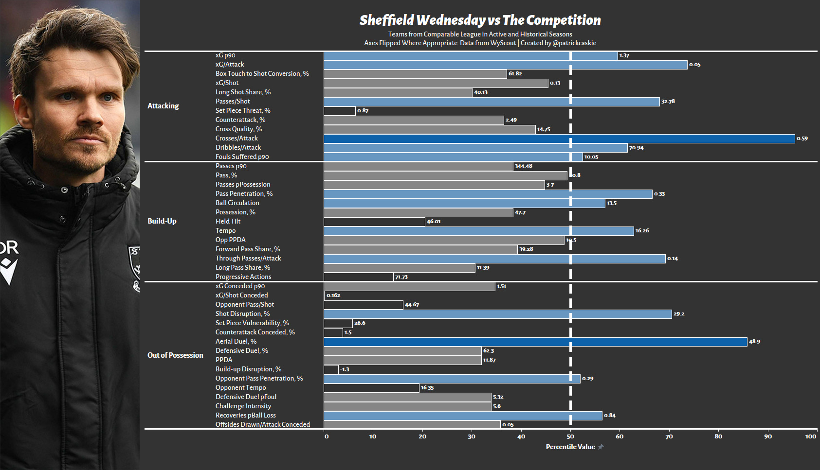 They dominated possession, had long controlled chains of possession, almost always played the ball short and made good decisions in the final third to optimise shot and attack quality. They were heavily reliant on width to create, with near sample high crosses and dribbles per attack and were also very strong on the counter. Out of possession, they were the opposite; they were vulnerable, gave up good quality shots, failed to control the game, were unable to limit their opponents’ ability to build up and fouled too often.