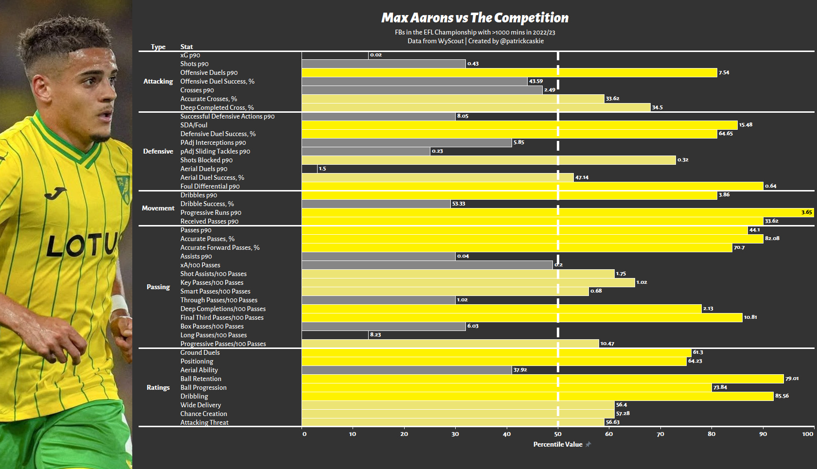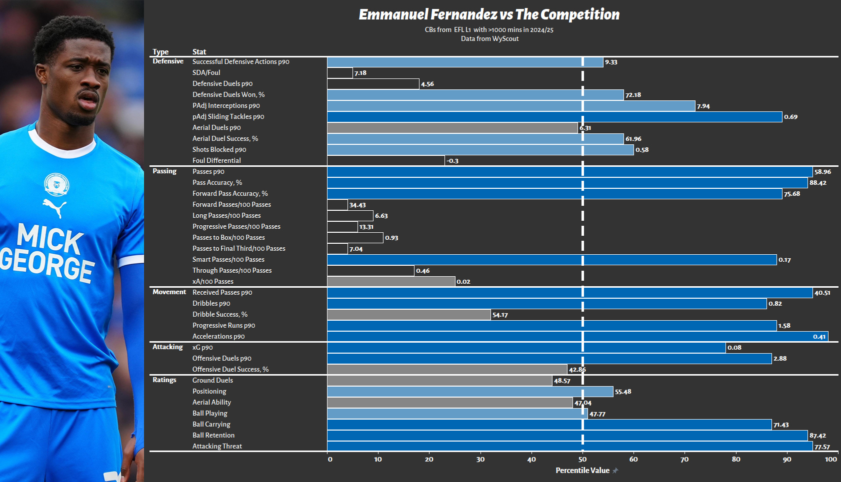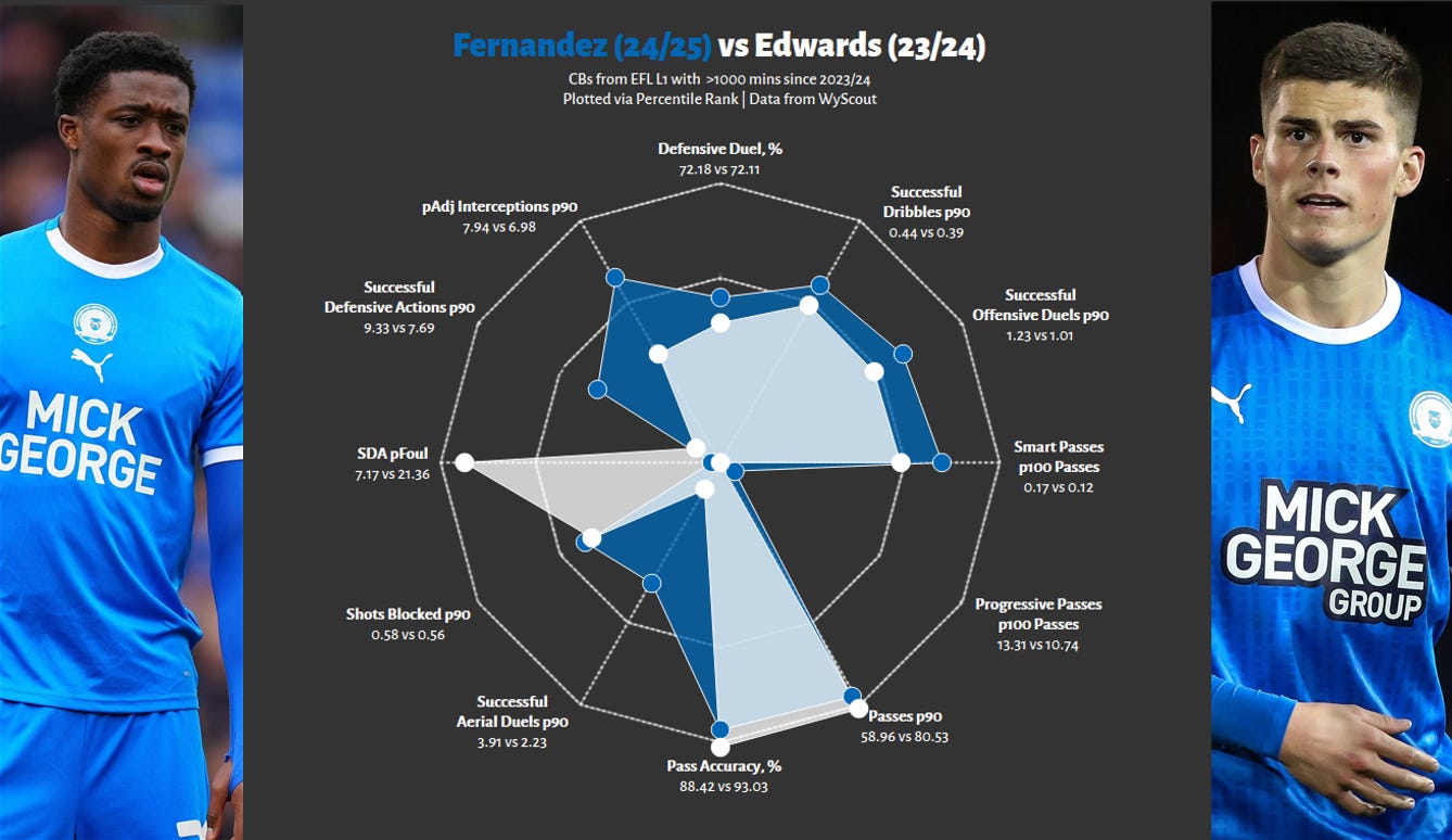 Beyond Wallin, we can take a step back and compare Fernandez to Peterborough’s previous CB sale, Ronnie Edwards. Edwards is significantly shorter than Fernandez, more experienced and was linked with a higher calibre of team for longer (Spurs/West Ham) before moving to Southampton for £4m. Edwards played in a slightly stronger Peterborough side, which is best evidenced by him playing over 20 more passes per 90, hitting a level rarely seen outside of the likes of Celtic/PSG