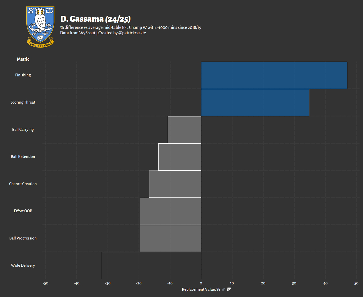Even with the pass types standardised to 100 passes, the data fails to take into account the quality of the team he played for; therefore, what looks like some average to above average creative passing numbers are slightly muted compared to what he likely can do on a better side, although you can equally question whether the difference in space, both on the ball and that provided to teammates may have actually made Dundee the optimal set-up for his creative/passing style, and that if anything the lack of space but increae in touches will prompt regression. I don’t think he will be the creative spark we need, but he should not add to the deficit. His lower pure chance creation numbers are likely somewhat masked by his high shot count, more of a shooter not creator as evidenced earlier. A key indication of how well he can transition will be his ability to pass on shooting chances to find better-placed teammates.