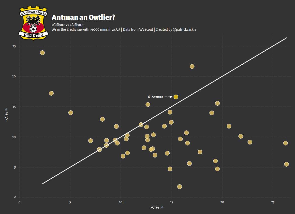 Beyond impressive absolute numbers, how does Antman stack up in relative terms? We can agree that all goals and assists are not made equally. Stacking up a 10 and 10 season for PSV is a common occurrence, but 10 and 10 for Excelsior is notable. This lens is adopted below, looking at a player’s xG and xA share, %. Antman is above average for both, but strays slightly to the left of the trendline, suggesting the Finn is marginally more of a creator than a goalscorer.
