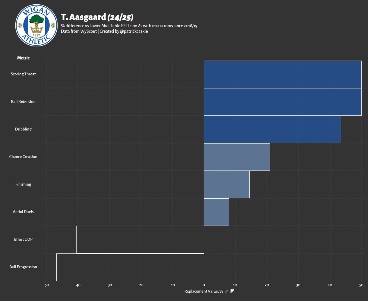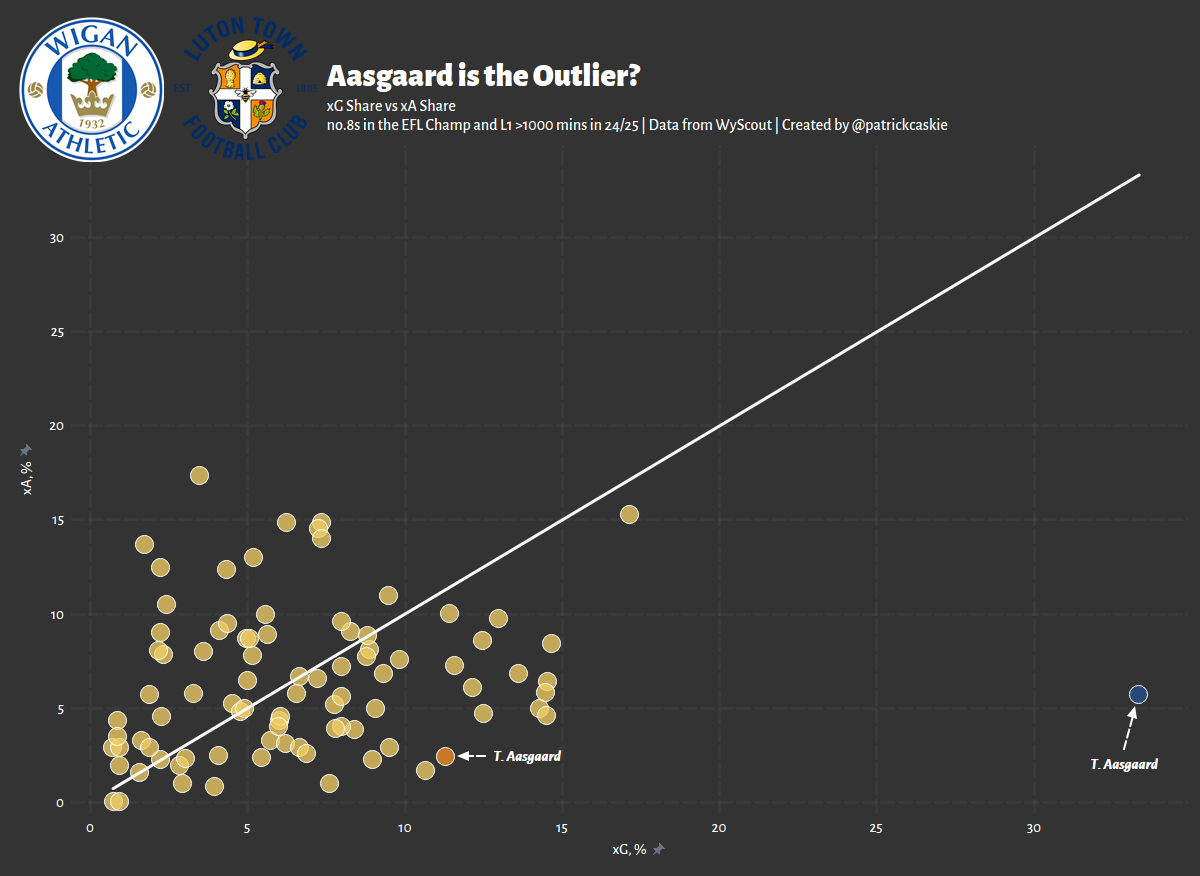 Cameron has turned heads for his ability to score and create in a side that fails to do much of that overall. Below we can see that he leads all other no.8s in the league when it comes to doing so on a relative basis, providing a near equal creative and scoring threat last season.