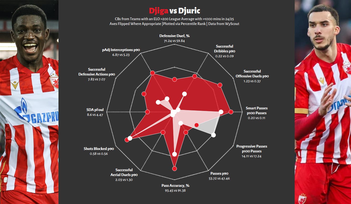 Reading Caley’s curves, you can expect a CB to enjoy a looser interpretation of their “peak” between the ages of 22.5 and 30.1, with their absolute “peak” occurring exactly at 26. Should we want to break it down even further and cherry-pick for highly relevant centre-back actions, then refer to the list produced when analysing Djiga.